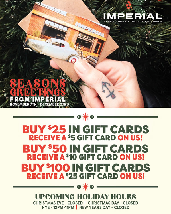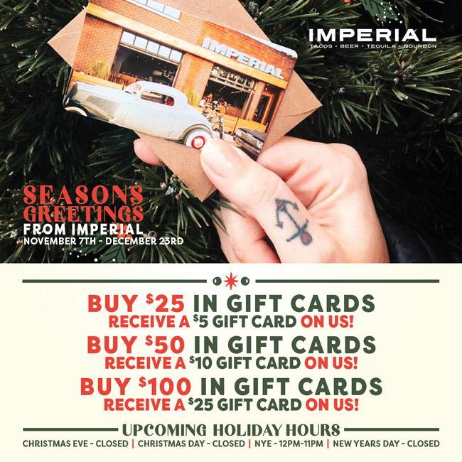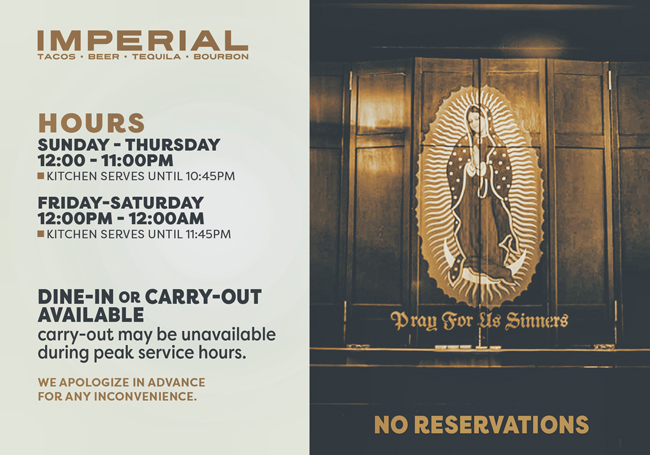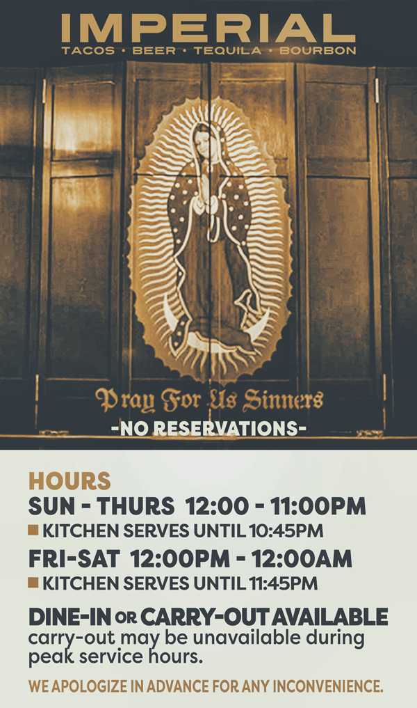 Imperial is somewhere you'll always find a cold can of beer, enjoy a great whiskey or tequila and if you're in the mood... LA working class tacos.